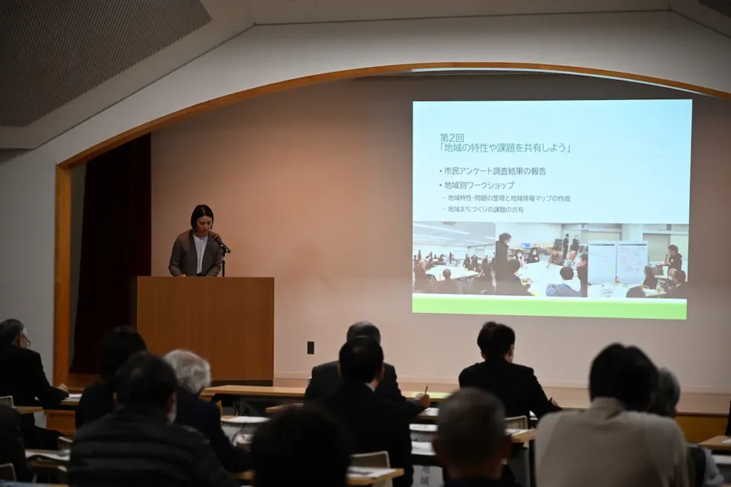 前半はワークショップからの提案として、地域毎にまちづくりの課題や今後の取り組みアイディアなどの発表があり、住民代表の方から市長への提案書の提出が行われました。