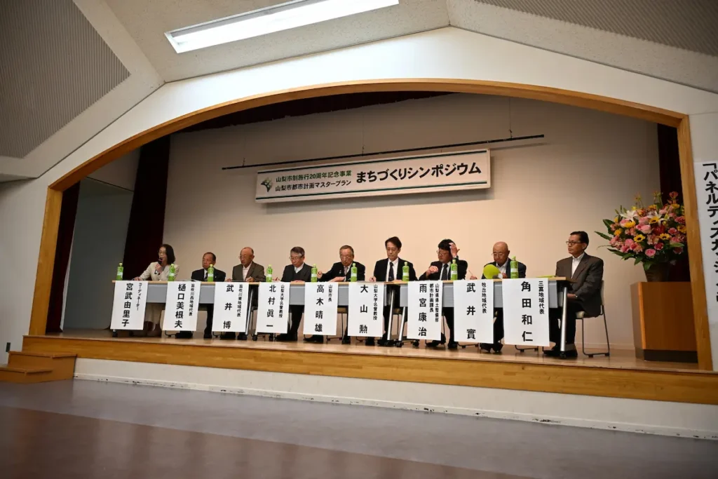 後半は、山梨大学の大山名誉教授・北村名誉教授、山梨県の雨宮都市計画課長、山梨市の高木市長、そして各地域の住民代表の方によるパネルディスカッションが行われました。